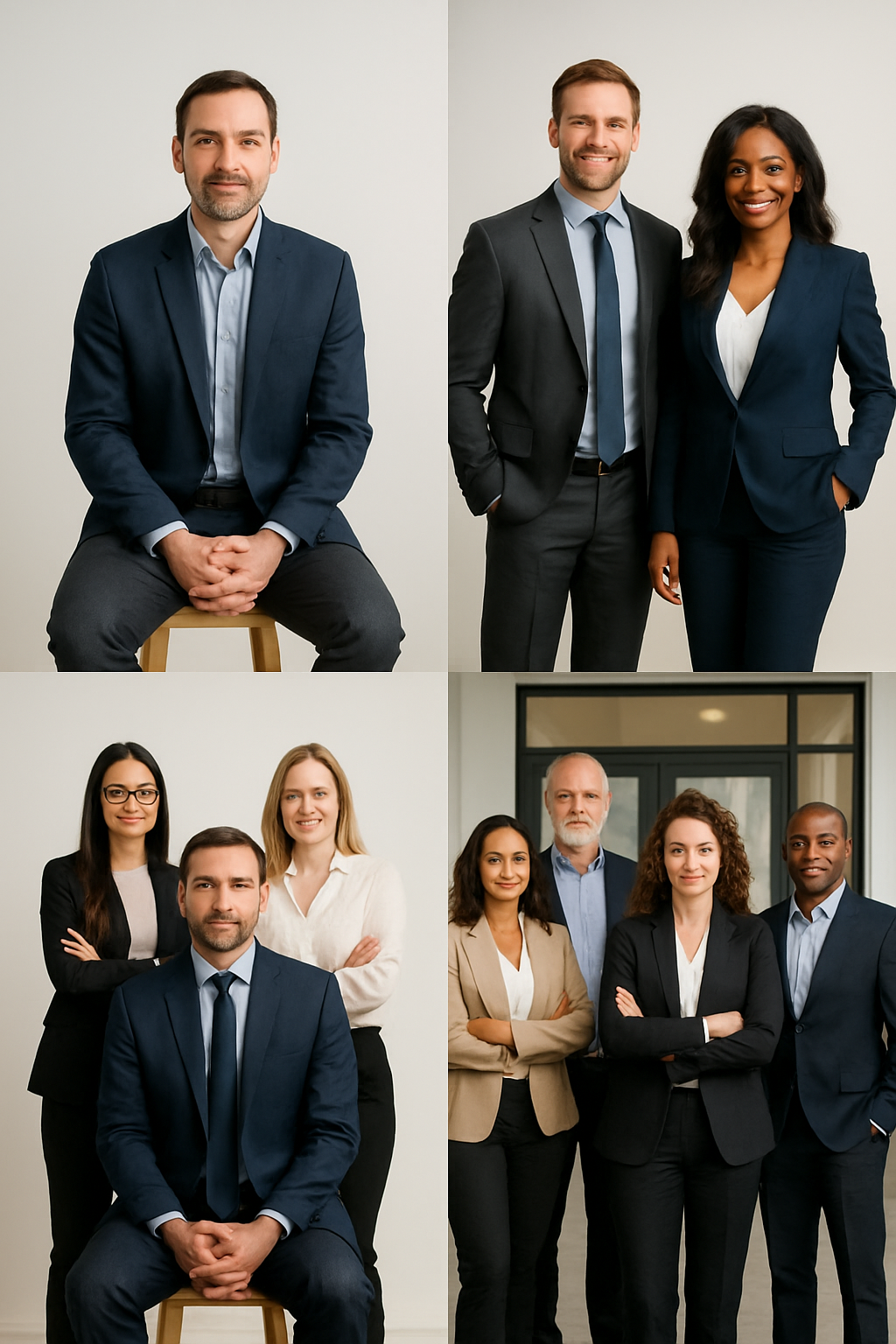 Des portraits professionnels au rendu soigné, sur fond neutre ou coloré selon votre image de marque. Parfait pour CV, site web, réseaux professionnels ou communication interne.